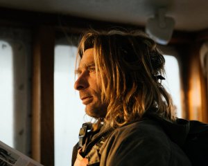 , a lobster boat, in the open ocean surrounding Montauk. Best friends for decades, Aldridge and Sosinski are seasoned sailors and fishermen.